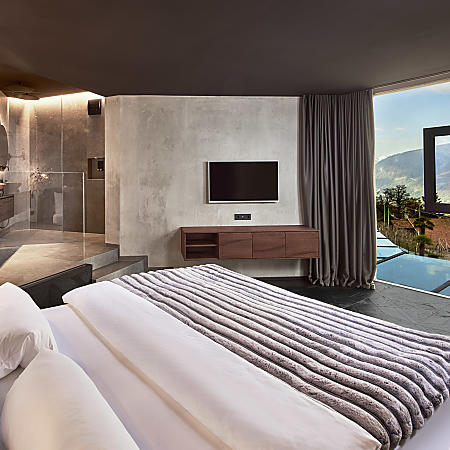 Auch im Inneren Ihrer Suite sind Sie der Natur nie fern. Die große Glasfront gibt den Blick frei auf den Talkessel von Meran, das malerische Dorf Tirol, die Mutspitze und den goldroten Sonnenuntergang über dem Vinschgau. Genießen Sie den Ausblick vom Bett aus, mit einem Glas Champagner in der Hand oder Seite an Seite mit Ihrer Lieblingsperson. Wenn der Blick nämlich weit wird, werden es auch die Gedanken. Erlauben Sie sich, Ihre kühnsten Träume zu Ende zu denken, oder nehmen Sie sich die Zeit, um wichtige Entscheidungen zu treffen oder große Pläne zu fassen. Hier scheint nichts unmöglich...