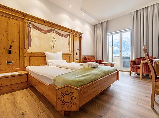 Im alpinen Style eingerichtet, mit elegantem Altholz, große Fensterfront zur Talseite mit traumhaftem Ausblick, Schlaf-Wohnraum, Sitzecke, klimatisiert, Bad, Dusche, getrenntes WC & Bidet, Kosmetikspiegel, Haarfön, Flachbild-SAT-TV, Frigobar, W-LAN, Tel., Safe, großer Westbalkon mit Sitzgarnitur. Hunde nicht erlaubt.