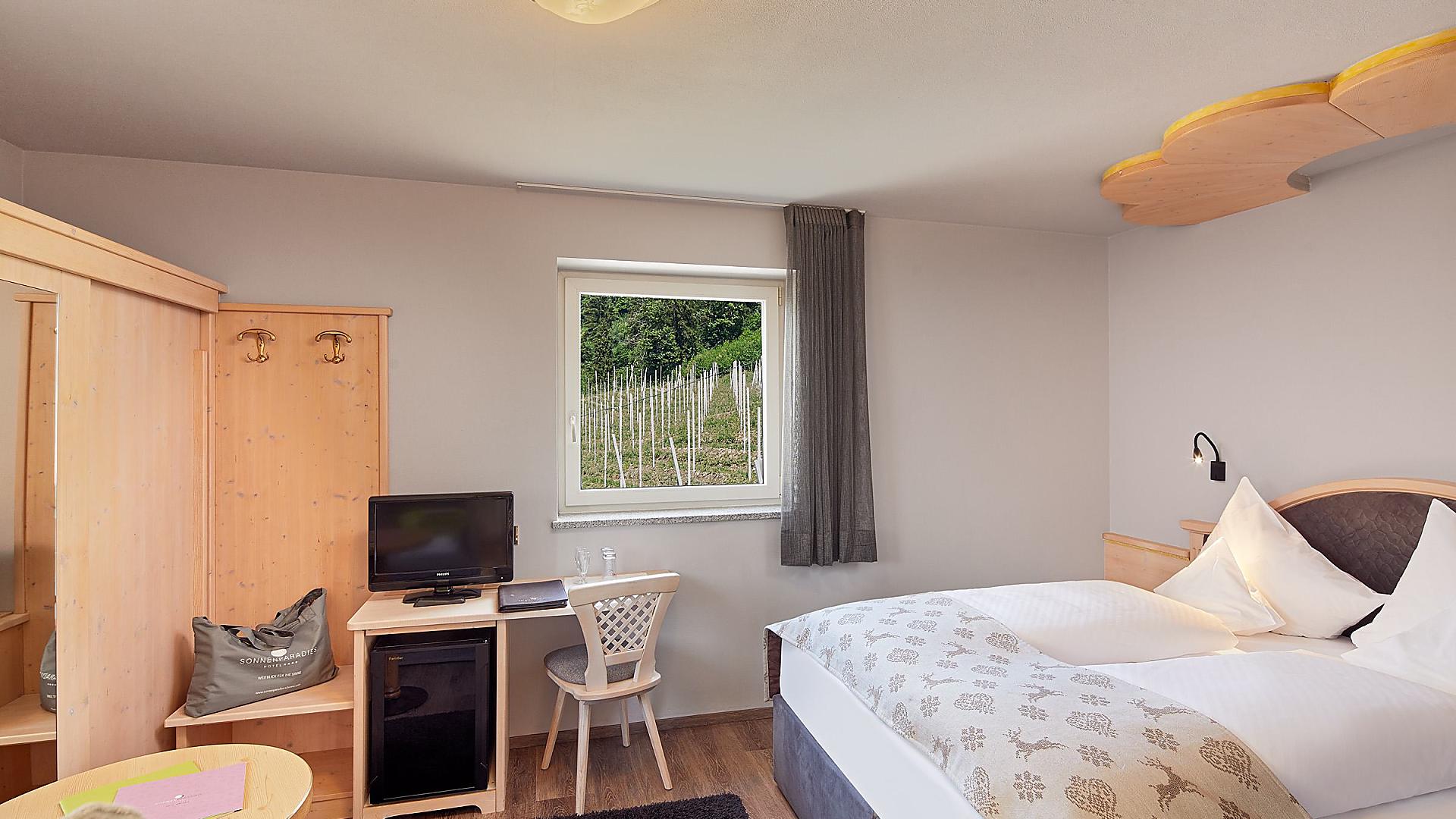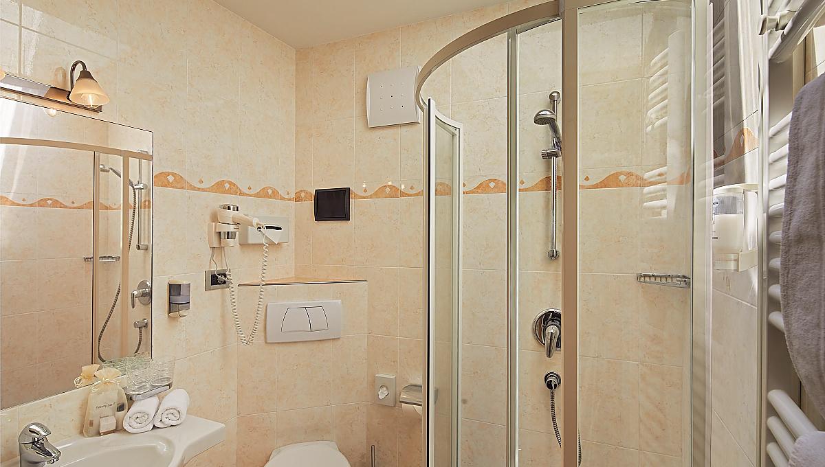 Im Landhausstil eingerichtet, Schlaf-Wohnraum mit Sitzgelegenheit, Bad, Dusche, WC, Bidet, Kosmetikspiegel, Haarfön, Flachbild-SAT-TV, Frigobar, W-LAN, Tel., Safe, ohne Balkon. Nord-West-Ausrichtung.