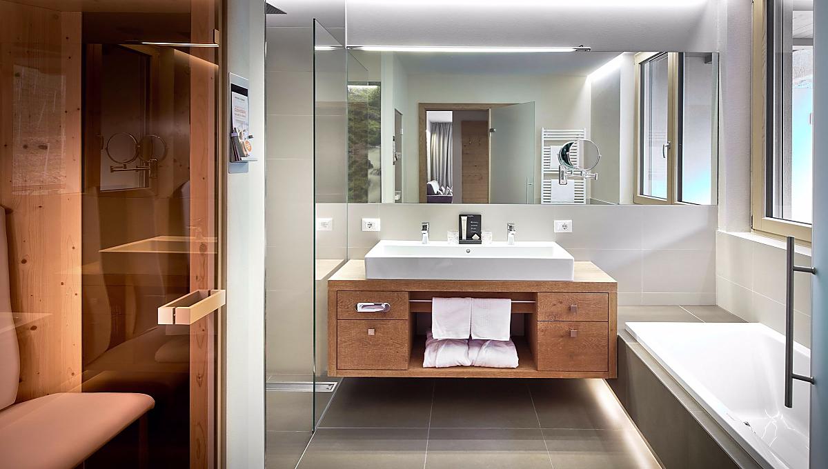Im alpinen Style eingerichtet, mit elegantem Altholz, Schlaf-Wohnraum, große Fensterfront zur Südseite, mit traumhaftem Ausblick, klimatisiert, Physiotherm Infrarotkabine, Bad, Dusche, Badewanne, getrenntes WC & Bidet, Kosmetikspiegel, Haarfoen, Flachbild-SAT-TV, Frigobar, WLAN, Tel, Safe, Südbalkon mit Sitzgarnitur, Dachgarten mit Liegen, Finnische Panoramasauna und exklusivem Whirlpool (der Whirlpool ist von 09.00 Uhr bis 22.00 Uhr nutzbar). Hunde nicht erlaubt. Tiefgaragenstellplatz inklusive.