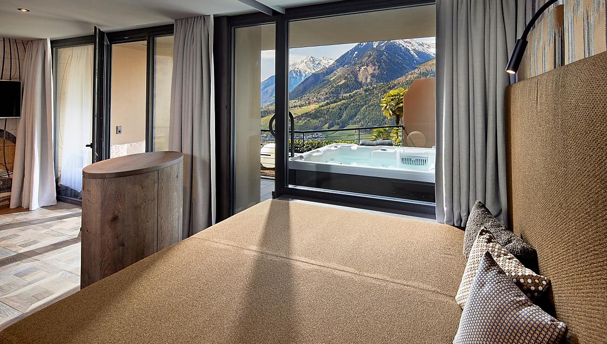 Im alpinen Style eingerichtet, große Fensterfront zur West/Talseite mit traumhaftem Ausblick, klimatisiert, Badezimmer mit Dusche, getrenntes WC & Bidet, Kosmetikspiegel, Haarfön, Flachbild-SAT-TV, Frigobar, WLAN, Tel, Safe, großer Westbalkon mit Liegeecke, Finnischer Sauna und exklusivem Whirlpool (der Whirlpool ist von 09.00 Uhr bis 22.00 Uhr nutzbar). Hunde nicht erlaubt. Tiefgaragenstellplatz inklusive.