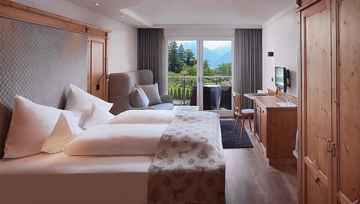 Furnished in the rustic style, bedroom-living room with seating, bath, shower, WC, cosmetics mirror, hair-drier, flat-screen satellite TV, mini-bar, W-LAN, telephone, safe, large balcony on the south/valley side with seating.