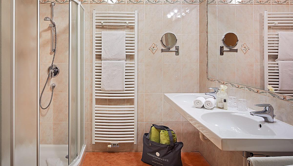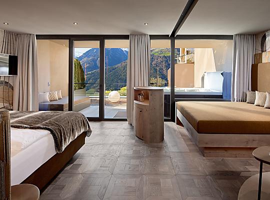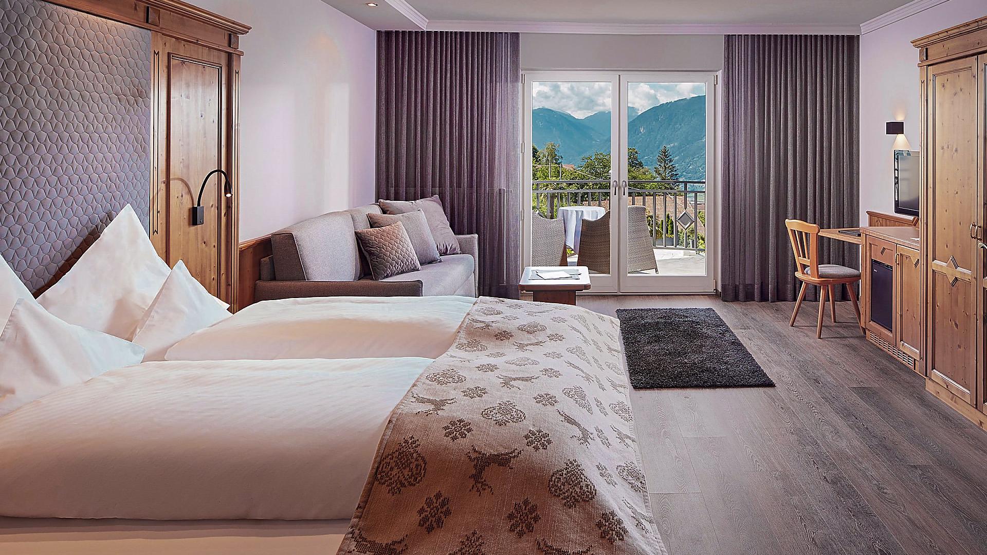 Furnished in the rustic style, bedroom-living room with seating, bath, shower, separate WC, bidet, cosmetics mirror, hair-drier, flat-screen satellite TV, mini-bar, W-LAN, telephone, safe, large balcony on the south/valley side with seating.