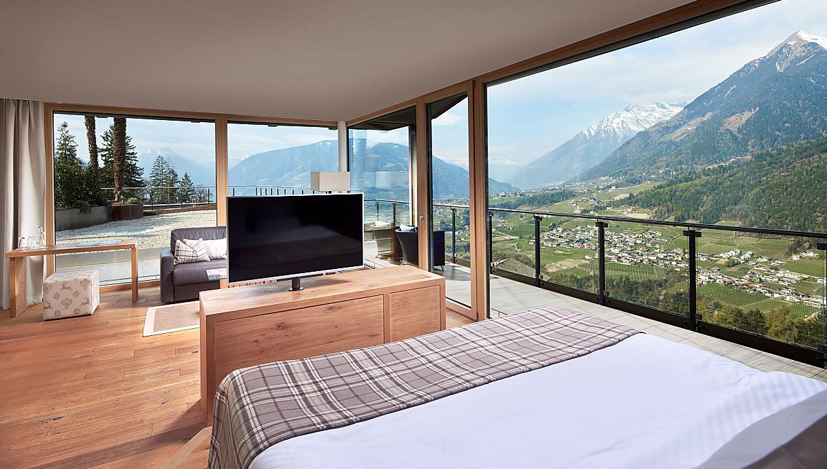 Furnished in the Alpine style, with elegant matured timber, large windows on the south and west side with fabulous view, air-conditioned, with its own panorama wellness area with Finnish and organic herbal steam sauna, seating area, bathroom, shower, bath separate WC and bidet, cosmetics mirror, hair-drier, walk-in wardrobe, flat-screen satellite TV, mini-bar, W-LAN, telephone, safe, west balcony with seating area, roof garden with loungers and exclusive whirlpool bath (the whirlpool can be used from 08:30 to 22:00). No dogs. Garage parking space included.