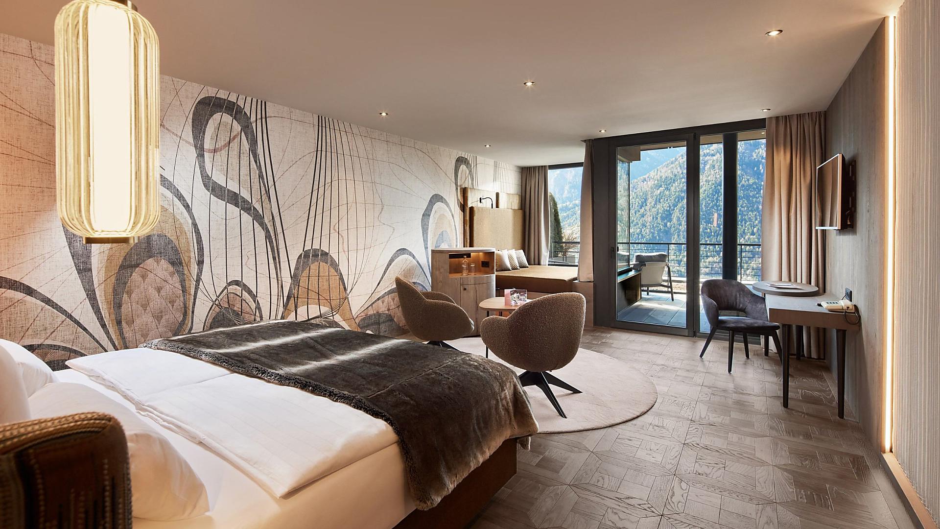 Furnished in alpine style, large west-facing panoramic windows offering a stunning valley view, air-conditioned, bathroom with shower, separate WC & bidet, cosmetic mirror, hairdryer, wardrobe, flat-screen satellite TV, minibar, Wi-Fi, telephone, safe, spacious west-facing balcony with lounging area. Pets are not allowed. Underground parking space included.