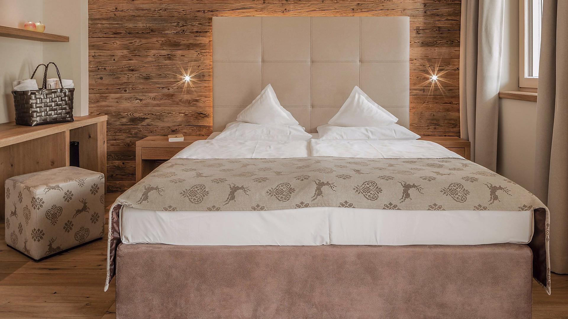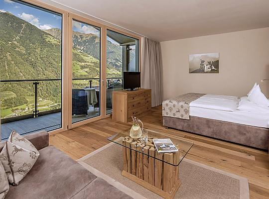Aria condizionata, zona sogg., doccia, WC, fon, specchio cosmesi, telefono, safe, TV SAT-flat-screen, connessione Internet, frigobar, grande balcone sul lato valle con vista panoramica. Cani non ammessi.