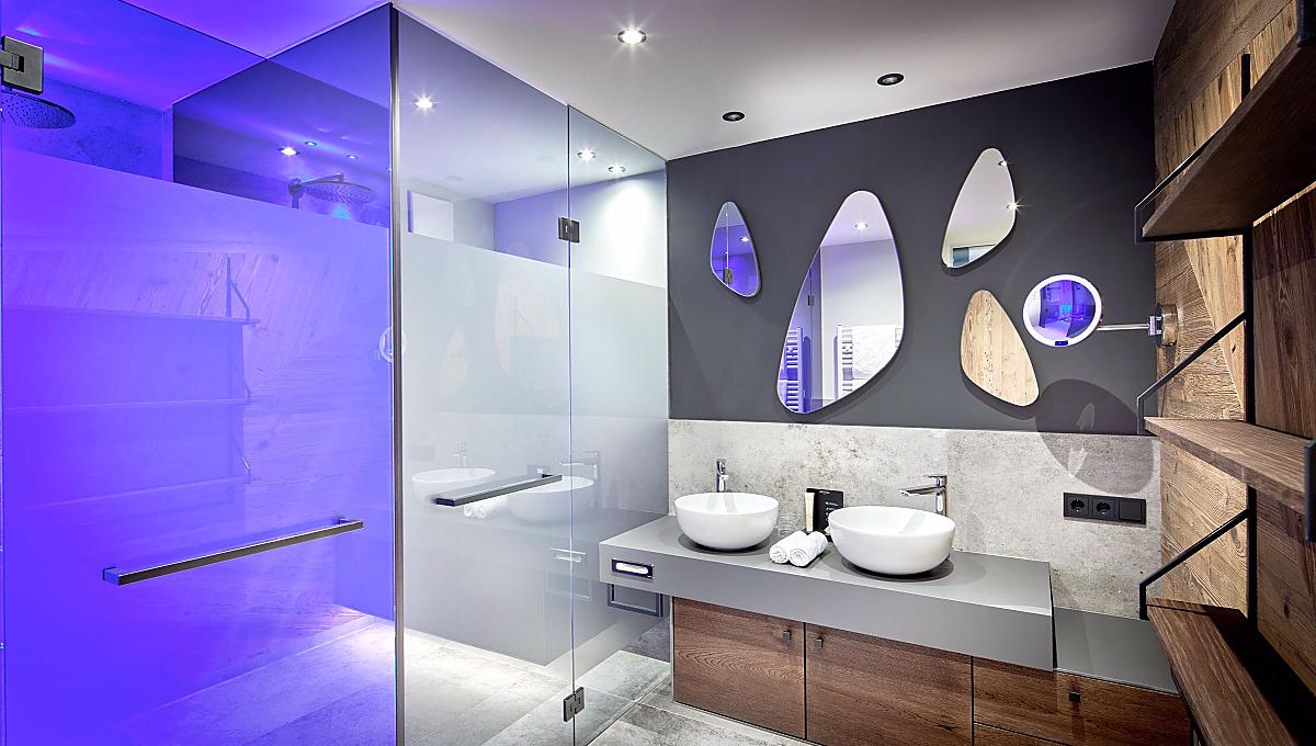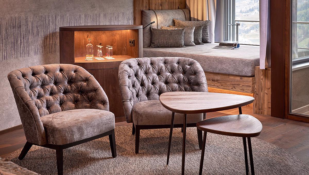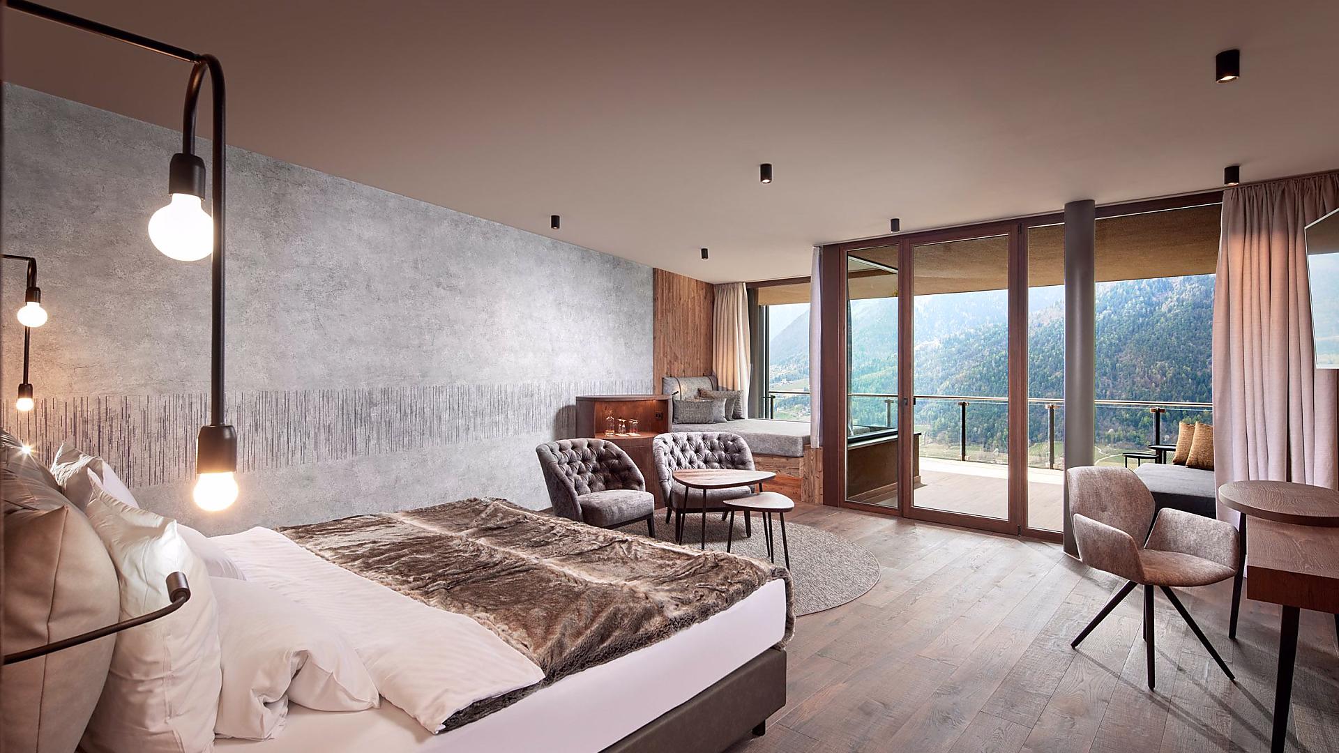 In stile alpino, grande finestra sul lato ovest/valle con vista panoramica, aria condizionata, bagno con doccia, WC e bidet separati, specchio cosmesi, asciugacapelli, armadio, TV satellitare a schermo piatto, frigo bar, WLAN, telefono, cassaforte, grande balcone rivolto verso valle con lettini relax e vasca d’idromassaggio esclusiva (l'idromassaggio può essere utilizzato dalle ore 08.30 alle ore 22.00). Cani non ammessi. Posto auto in garage incluso.