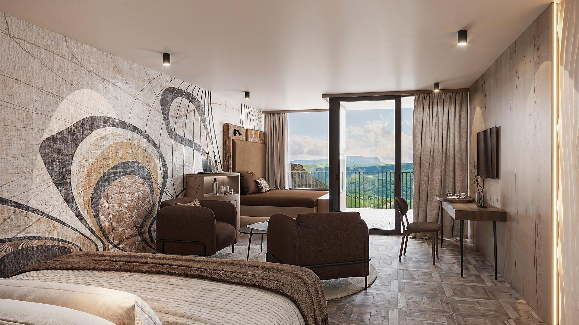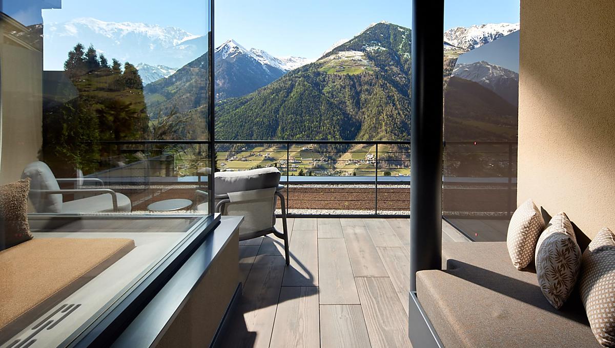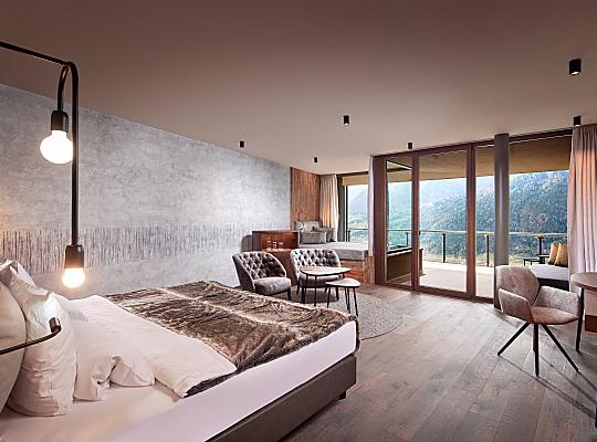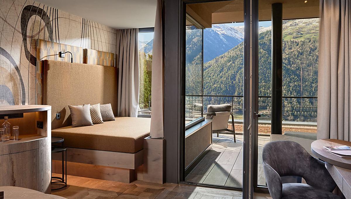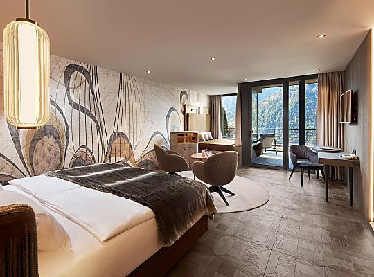 Im alpinen Style eingerichtet, große Fensterfront zur West/Talseite mit traumhaftem Ausblick, klimatisiert, Badezimmer mit Dusche, getrenntes WC & Bidet, Kosmetikspiegel, Haarfön, Kleiderschrank, Flachbild-SAT-TV, Frigobar, WLAN, Tel, Safe, großer Westbalkon mit Liegeecke. Hunde nicht erlaubt. Tiefgaragenstellplatz inklusive.