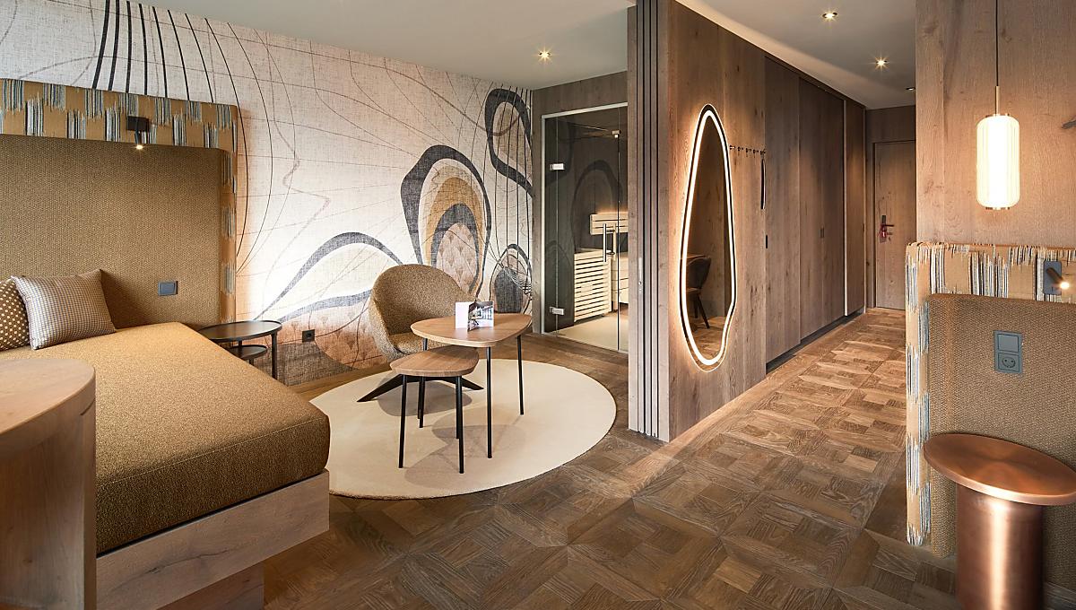 Arredata in stile alpino, ampia vetrata panoramica sul lato ovest/valle con vista mozzafiato, climatizzata, bagno con doccia, WC e bidet separati, specchio cosmetico, asciugacapelli, TV satellitare a schermo piatto, frigobar, Wi-Fi, telefono, cassaforte, ampio balcone rivolto a ovest con angolo relax, sauna finlandese e esclusiva vasca idromassaggio (l’idromassaggio è utilizzabile dalle 09:00 alle 22:00). Animali non ammessi. Posto auto in garage incluso.